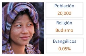 El 99% de ellos son budistas en una población de 20.000. Solo el 0,05 % se reconocen Evangélicos. Su alcance es difícil humanamente hablando porque viven en un país cerrado, pero NADA hay imposible para nuestro Dios. Oramos que sean liberados del miedo a los espíritus. Oramos por sueños y visiones para los lideres, para que el pueblo tenga la oportunidad de escuchar el Evangelio en su lengua y cultura. Por un movimiento de creación de discípulos que transforme las comunidades en Myanmar.